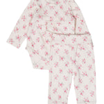 Nydelig sett med bukse og body i et delikat blomsterprint. Bodyen er tolags, med myk bambusviskose på innsiden og varm merinoull på utsiden. De fine rysjene på ermene gir antrekket et søtt og feminint preg.
