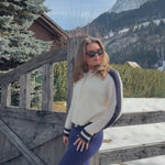 En perfekt strikket jakke til deg som ønsker både komfort og stil. Ulljakken er laget av 33% kid mohair, 33% ull, 28% nylon og 6% spandex. Dette gjør at den er lett, varm og behagelig med god stretch og holdbarhet. De marineblå delikate stripene på ermene og inni kragen gir et moderne og sporty uttrykk. Den chunky stilen gjør plagget tidløst og anvendelig. Perfekt til både hverdags bruk og sporty anledninger.