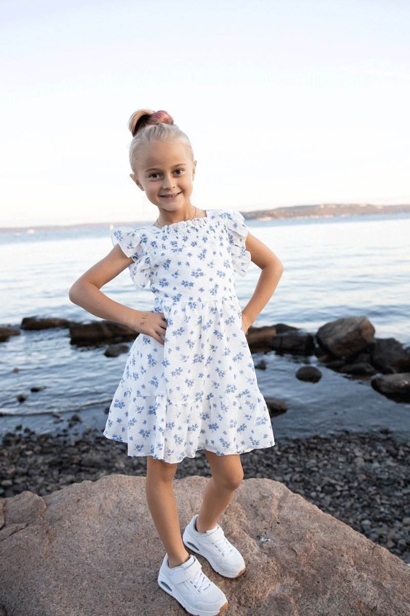 | Den vakre Linda-kjolen fra Vilje & Ve har et enkelt, ensfarget design med delikate volanger på ermene og et skjørt med flott volum. En skjult glidelås bak sikrer en ren og elegant passform. |
