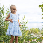 Vår nydelige Linda kjole med blomsterprint. Kjolen har volanger på ermene og rikelig med volum i skjørtet og skjult glidelås bak.