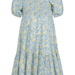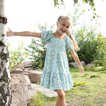 Vanja printet jersey kjole fra Vilje & Ve med vaffelsøm på brystet, puffermer og volanger nederst. Laget av myk behagelig jersey, er den perfekt for både hverdagslige og spesielle anledninger.