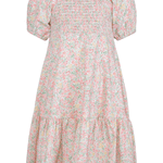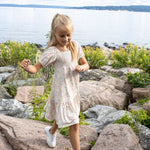 Vanja printet jersey kjole fra Vilje & Ve med vaffelsøm på brystet, puffermer og volanger nederst.  Laget av myk behagelig jersey, er den perfekt for både hverdagslige og spesielle anledninger.