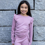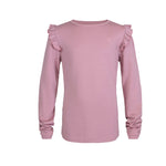 En nydelig ullgenser med volanger på skuldrene og rund hals. Laget med ull utside for varme og bambusviskose innsiden for en myk, kløfri følelse. Tilgjengelig i marineblå og dus lilla.