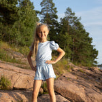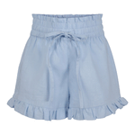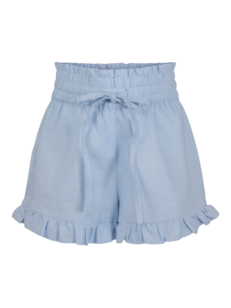 | Molly-shortsen i lyseblå lin- og bomullsblanding er både myk og behagelig. Den korte modellen med delikat rysjekant nederst gir et friskt og feminint preg, perfekt for sommerlige dager! |