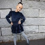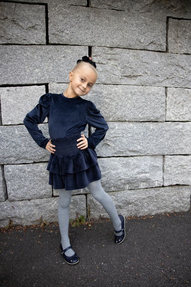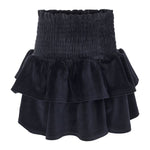 Nydelig marineblått skjørt med vaffelsøm i midjen og fine volanger. Voluminøst og kort skjørt som er laget i et deilig og behagelig velour stoff. Passer fint med Leona blusen.