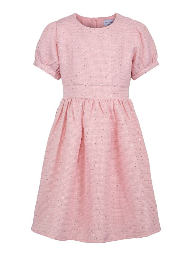 En drømmende kjole for små prinsesser. Sarina-kjolen kommer i en dus rosa farge og har knyting i livet bak for en søt og justerbar passform. Paljett detaljene gir et hint av glans og gjør kjolen perfekt til både bursdager og festlige anledninger.