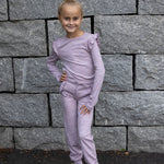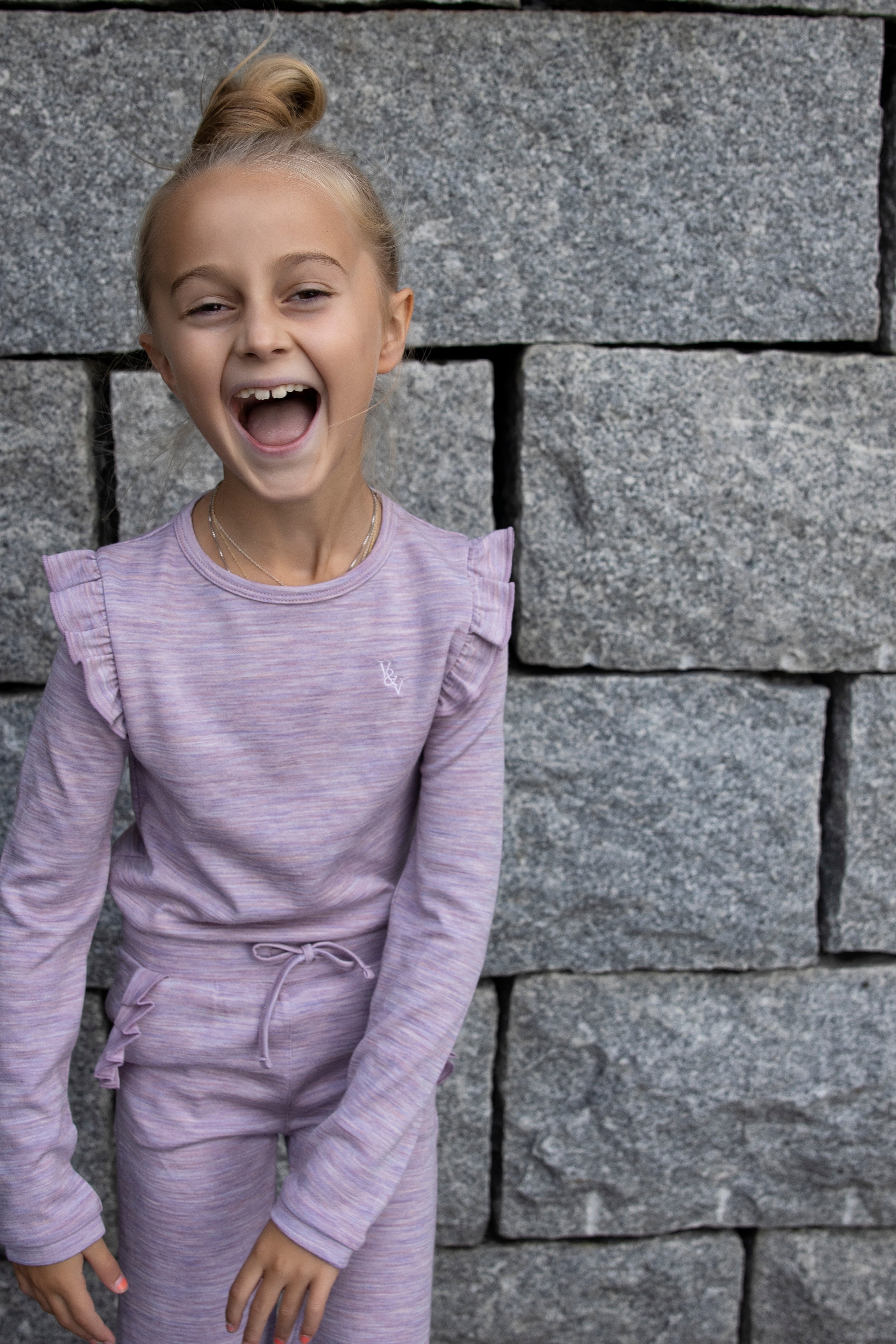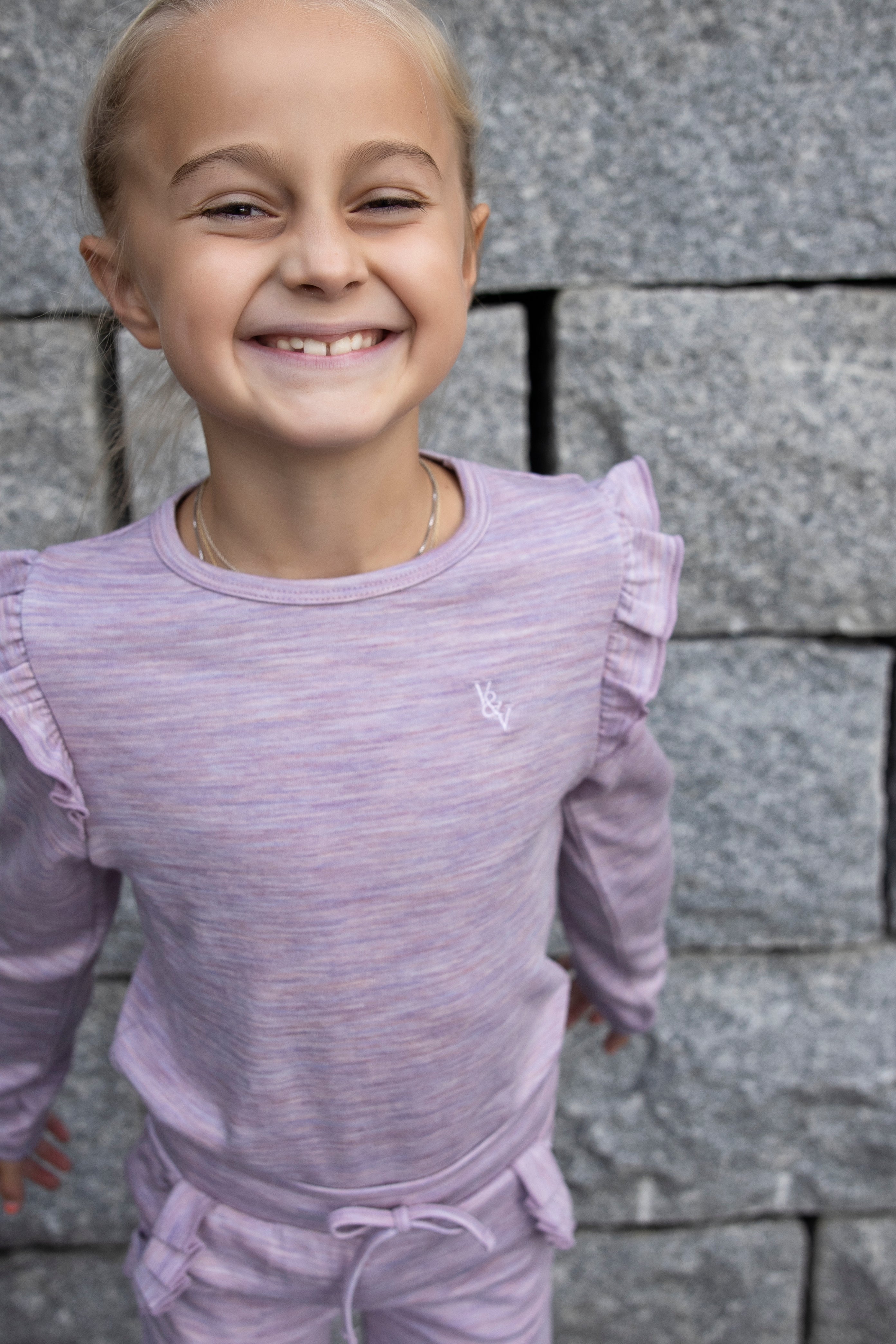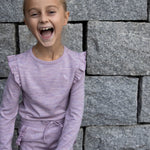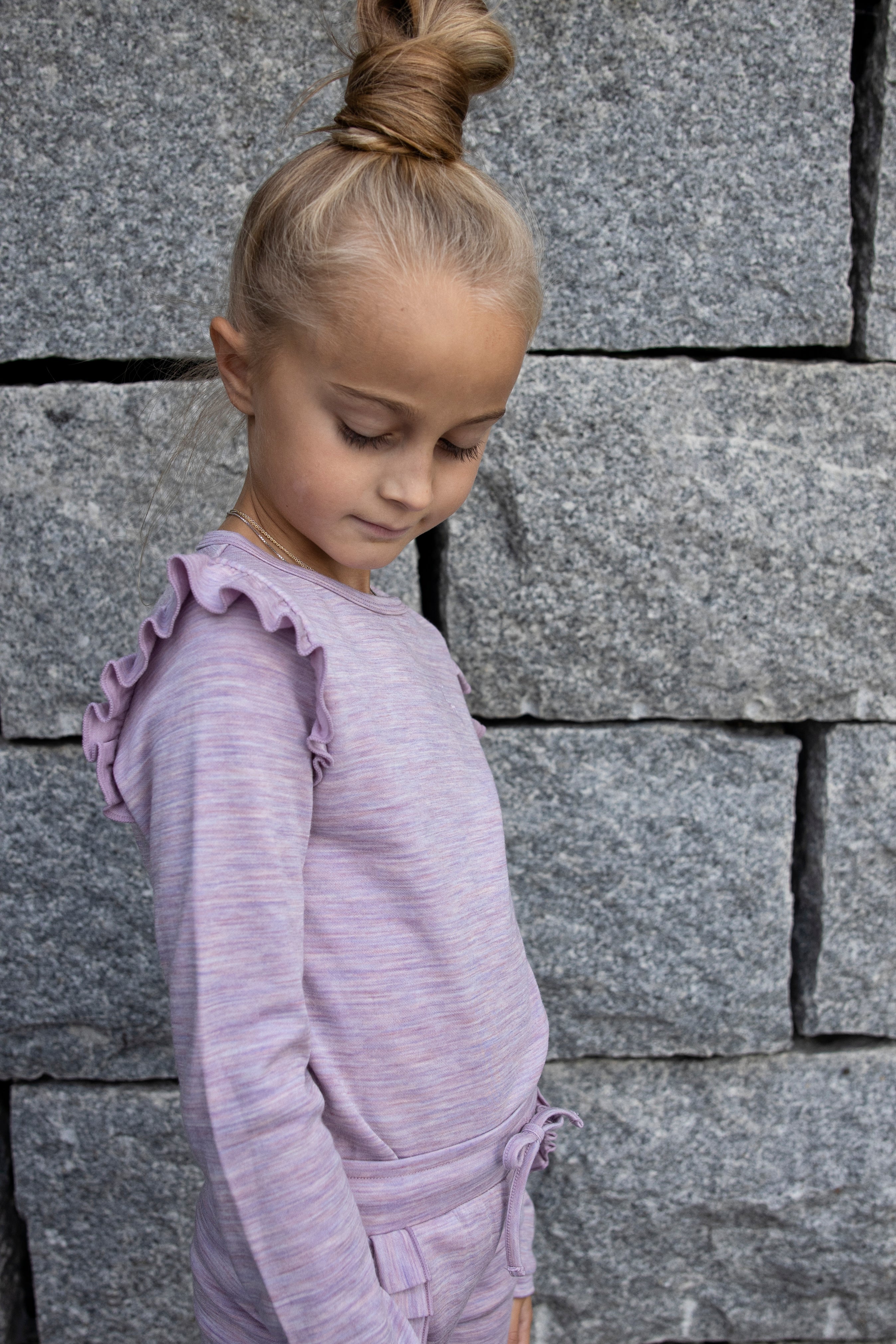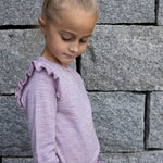 Dis er en enkel ullgenser med søte volanger ved skulder. Genseren har rund hals og kommer i en klassisk marineblå, i tillegg til denne duse lilla fargen.