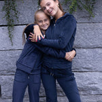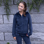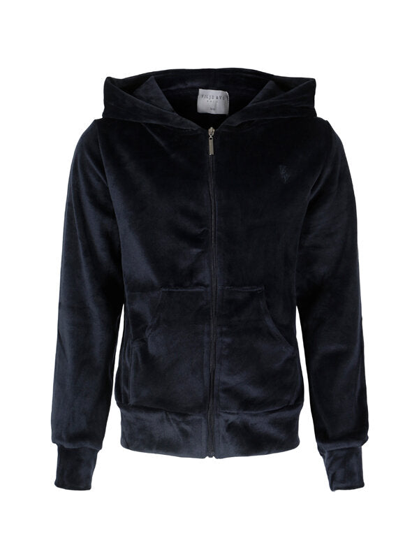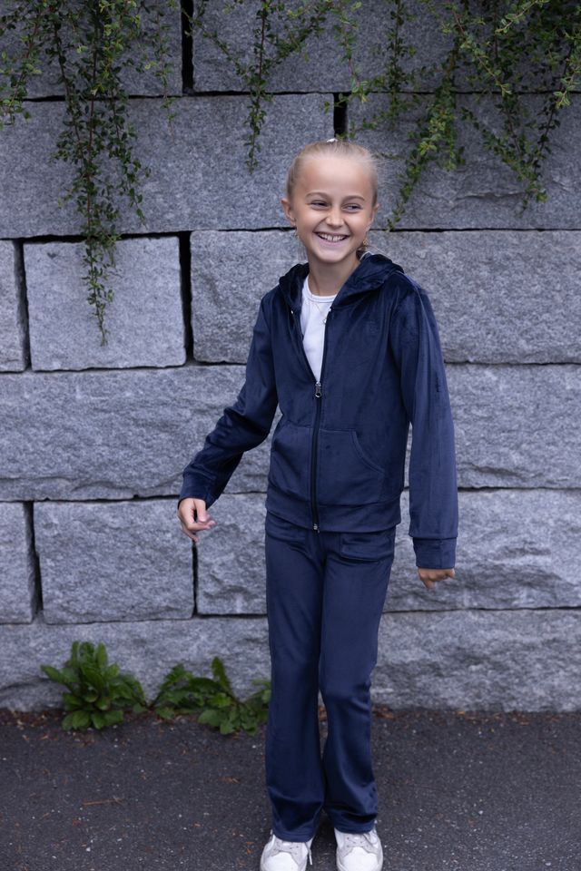 Hettejakke i myk velour. Glidelås og lommer i front. Brodert logo, ton i ton. Ermet avsluttes med en bred mansjett i samme myke materiale. Denne jakken ideell for både avslapping og lek. Passer perfekt med Hermine velour bukse.