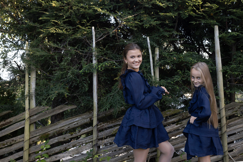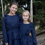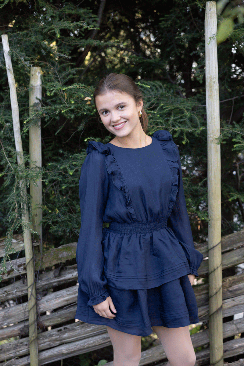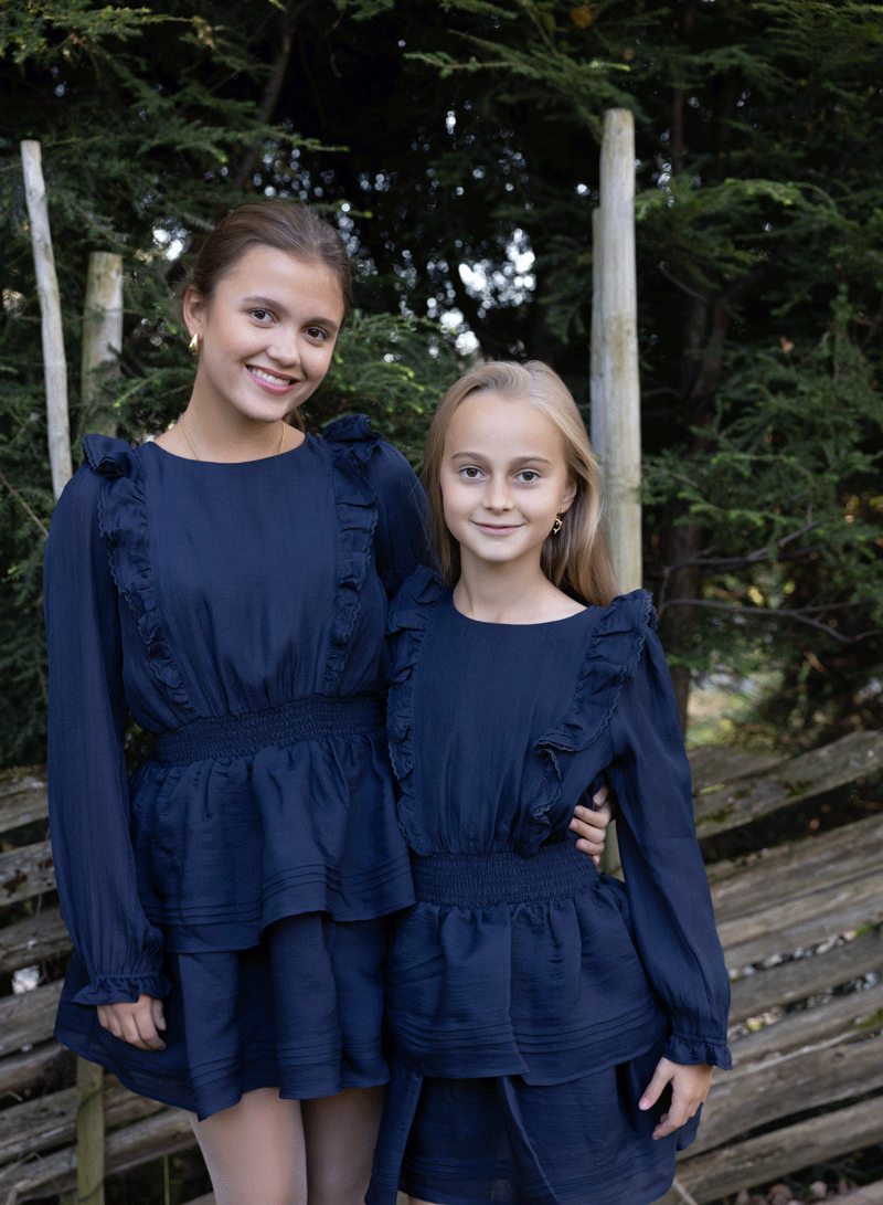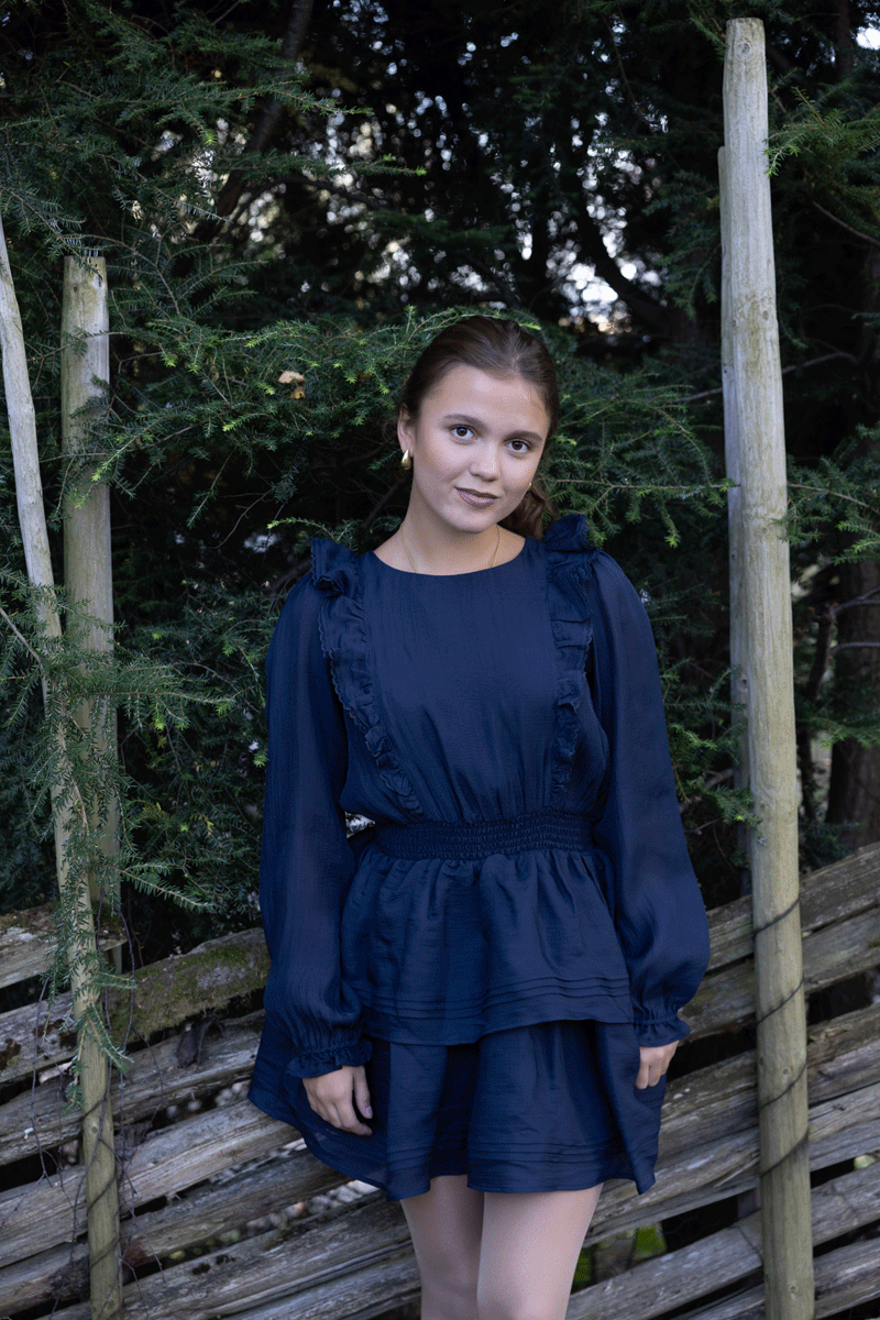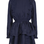 Ane kjole med smock i livet og lange ermer som gir en feminin og leken silhuett. Den marineblå fargen gjør kjolen både klassisk og perfekt for ulike anledninger. Sitter superfint på.