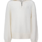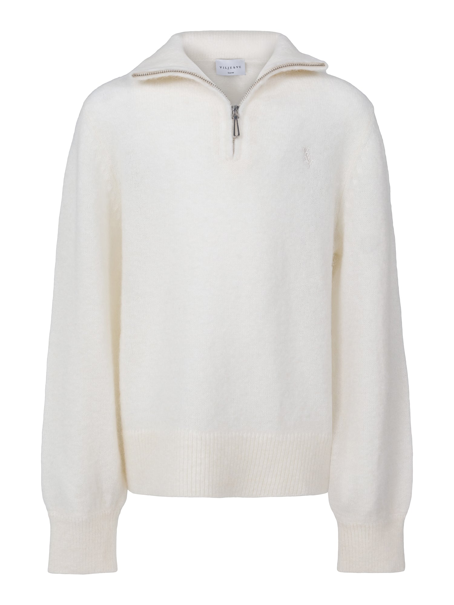 Kul, oversized strikkegenser til jente. Strikket i en supermyk og eksklusiv blanding av kidmohair og ull, med litt nylon og spandex for god passform og bevegelighet (33 % mohair, 33 % ull, 28 % nylon, 6 % spandex). Har delikate strikkedetaljer og en moderne half-zip glidelås i front. |