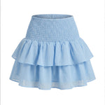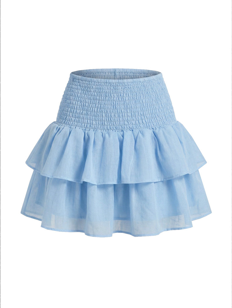 Dette elegante lys blå volangskjørtet passer perfekt til hverdagsbruk og sommerlige anledninger. Skjørtet har en flatterende passform med elastisk smock i midjen som gir god komfort og fleksibilitet. Det lette og luftige stoffet består av 80% polyester og 20% bomull, noe som gir en behagelig følelse mot huden. De feminine volangene skaper et søtt uttrykk og gir sommerskjørtet et romantisk løft. Kan styles med Lollo bluse eller Mia topp for et helhetlig antrekk.