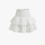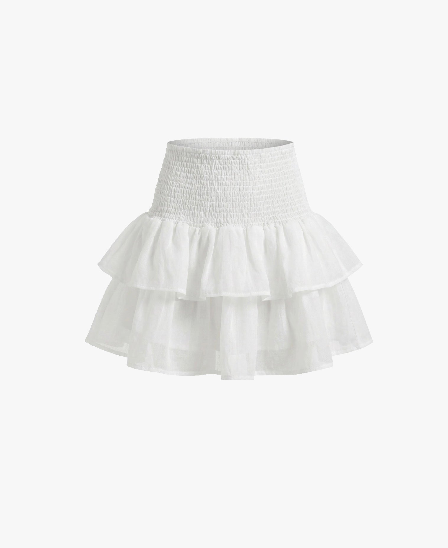 Dette elegante hvite volangskjørtet passer perfekt til hverdagsbruk og sommerlige anledninger. Skjørtet har en flatterende passform med elastisk smock i midjen som gir god komfort og fleksibilitet. Det lette og luftige stoffet består av 80% polyester og 20% bomull, noe som gir en behagelig følelse mot huden. De feminine volangene skaper et søtt uttrykk og gir sommerskjørtet et romantisk løft. Kan styles med Lollo bluse eller Mia topp for et helhetlig antrekk.
